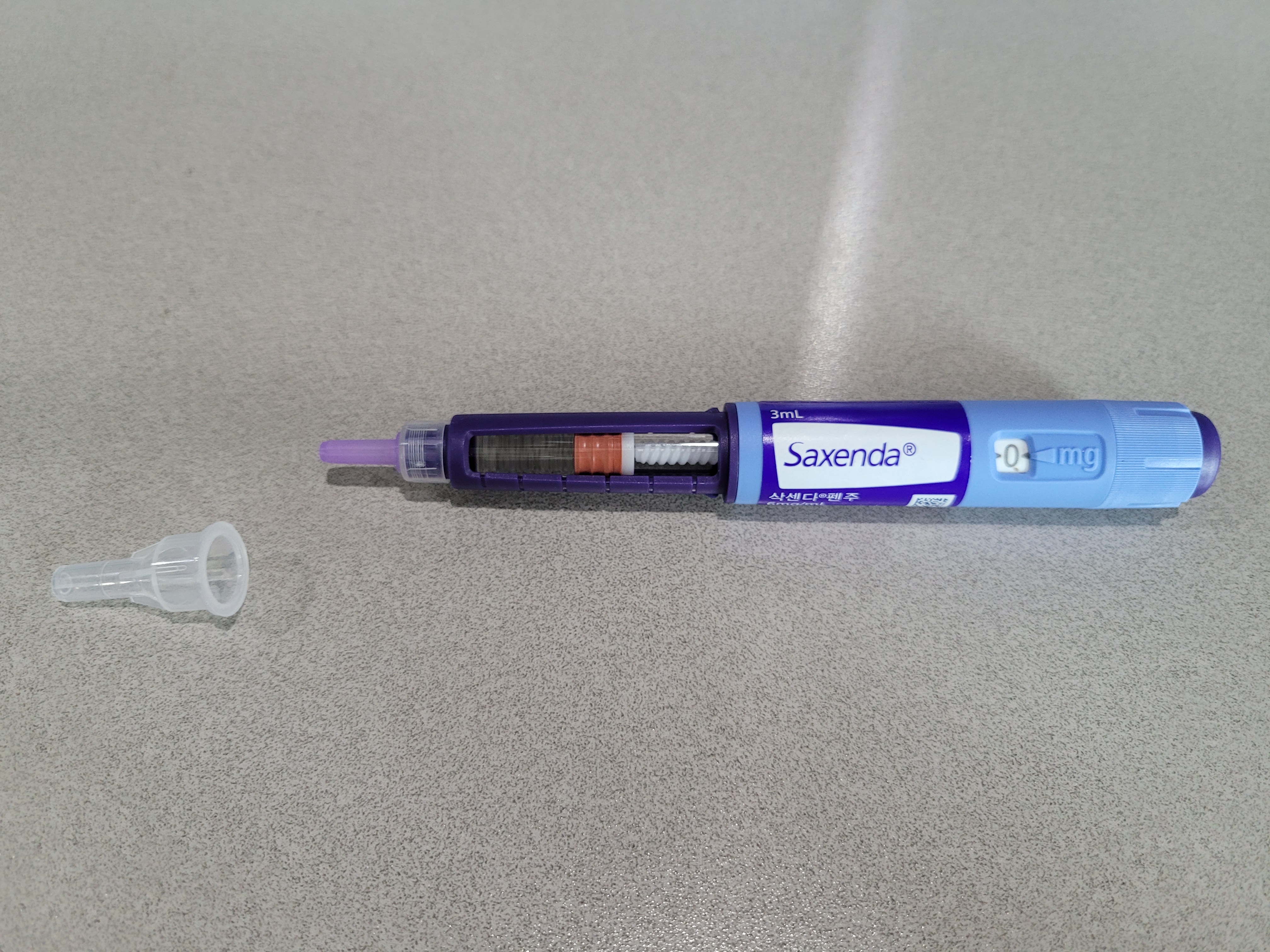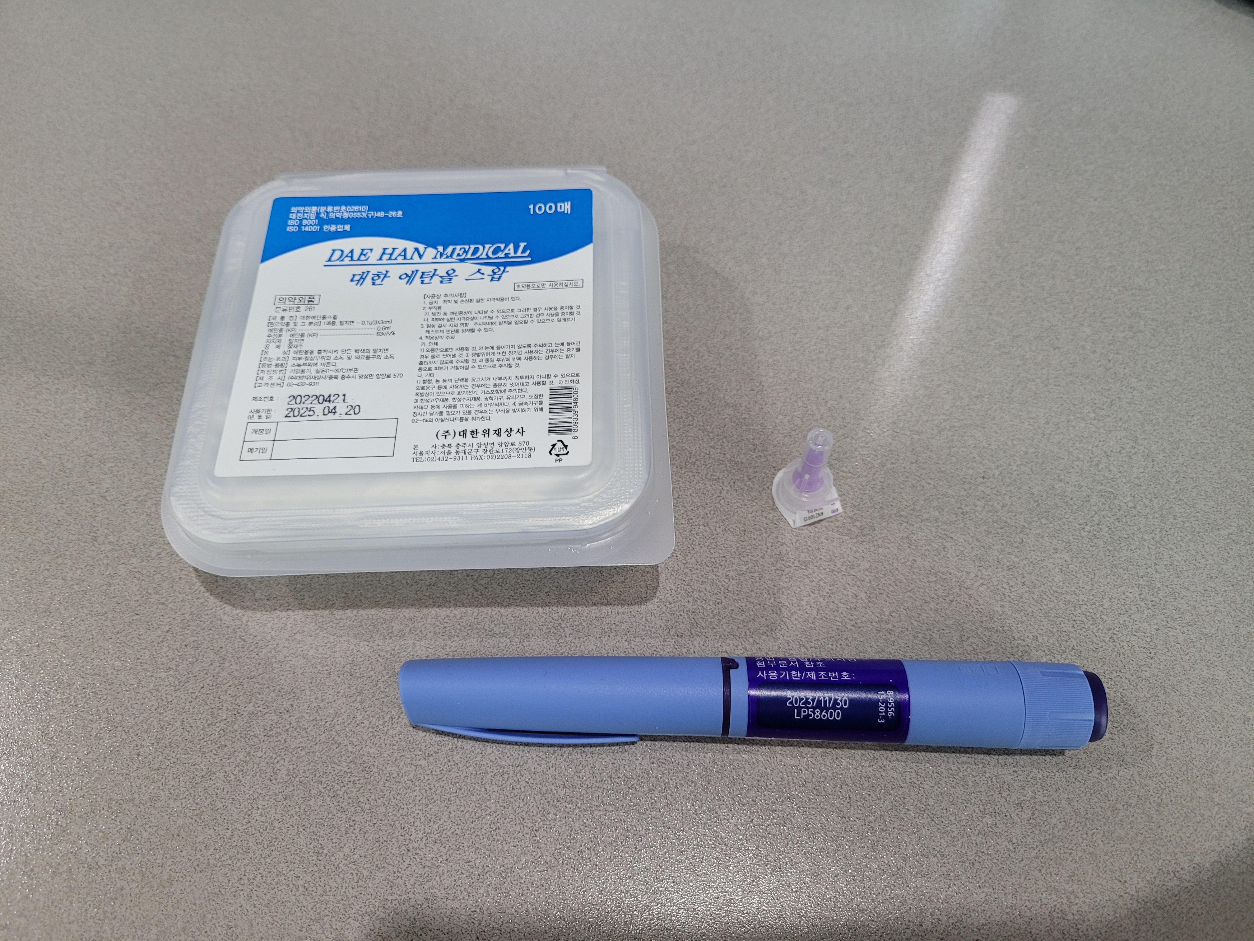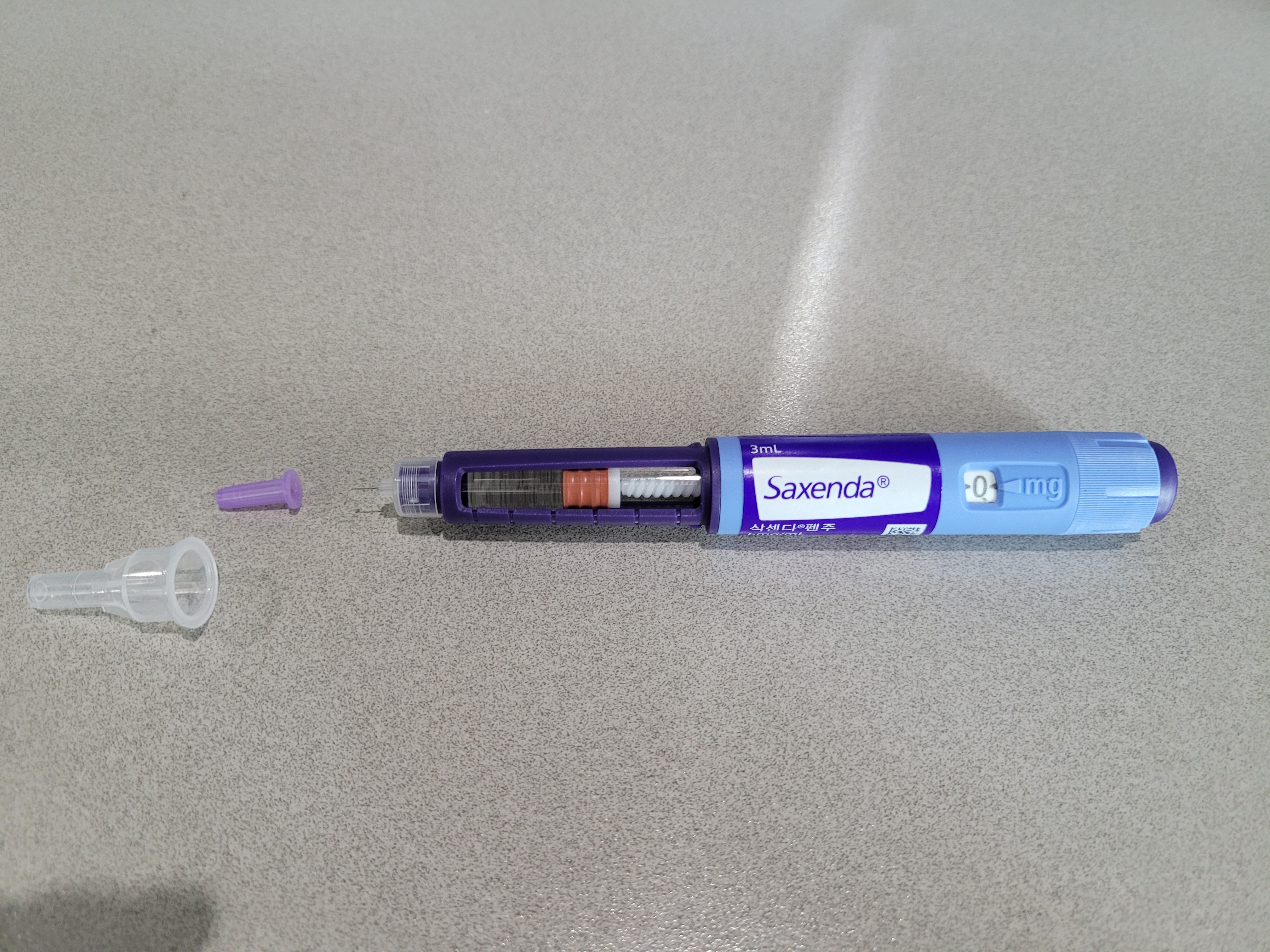 삭센다 주사를 위해 소독폼, 바늘, 삭센다 주사 3개를 가지고 다닙니다.
