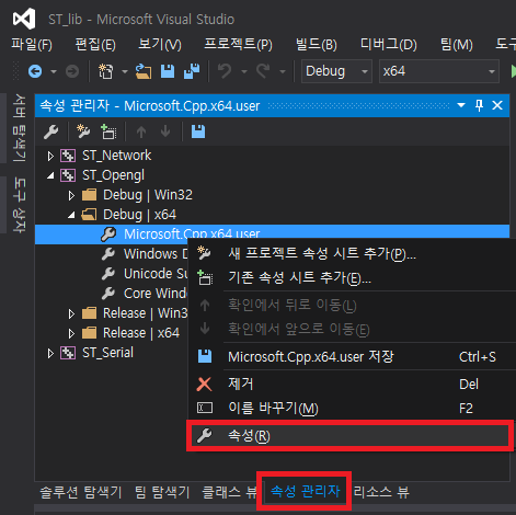 원하는 프로젝트 선택 후 -> 32 / 64비트, debug / release 선택 후