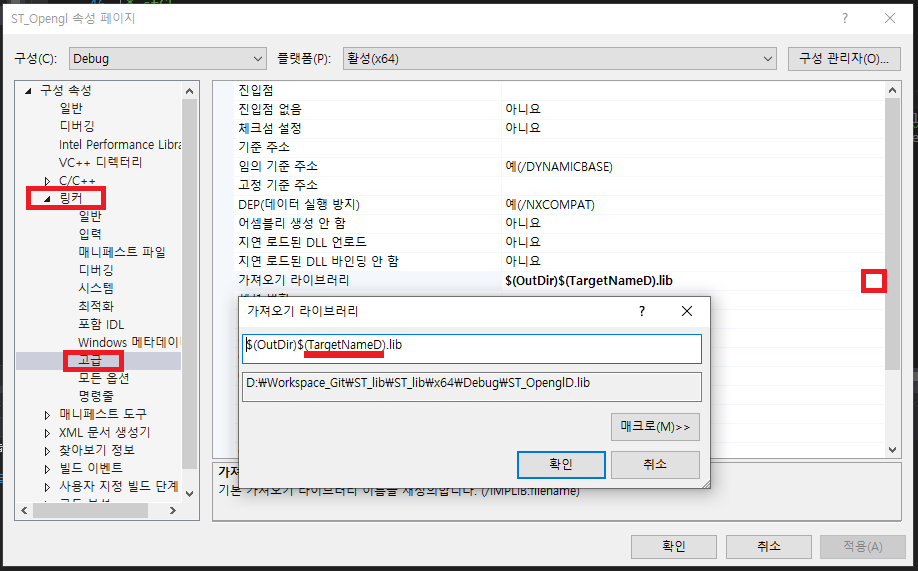 만약 DLL을 만든다고 하면 Lib 파일도 D를 붙여야 하기때문에 아래설정을 하나더 해줘야 합니다.